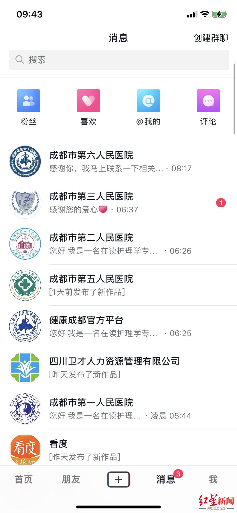 记者注意到,她分别向成都市第一人民医院、成都市第二人民医院、成都市第三人民医院、成都市第五人民医院、成都市第六人民医院等发去了自荐私信。