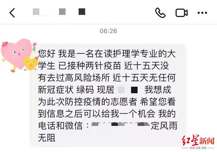 “您好,我是一名在读护理专业的大学生,已接种两针疫苗,近十五天没有去过高风险场所,近十五天无任何新冠症状,绿码。我想成为此次疫情的志愿者,希望您看到消息之后给我一个机会,定风雨无阻!”